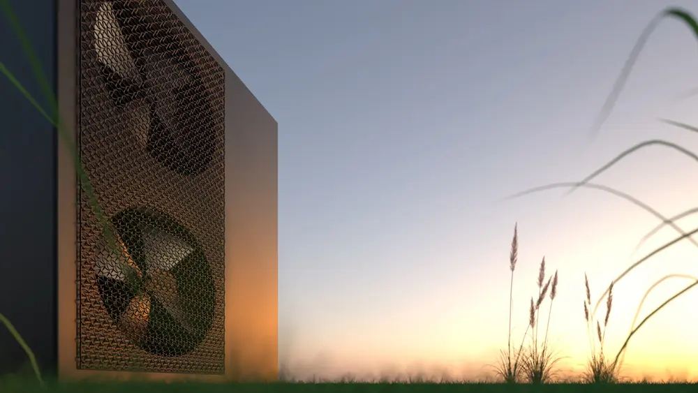 Ein weißer Batteriegroßspeicher mit steht vor Solarpaneelen und einem Windrad auf einer Wiese.